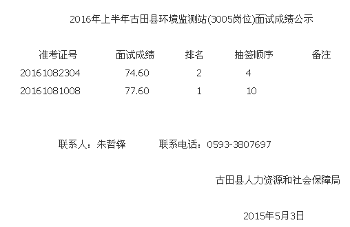 [图文]2016上半年福建古田县环境监测站招聘面试成绩公示(3005岗位)