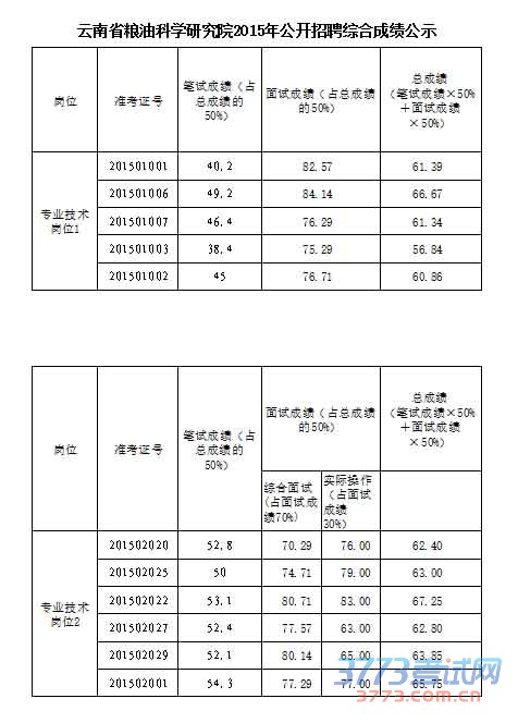 [组图]2015云南省粮油科学研究院招聘综合成绩公示