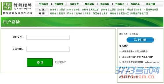 1.考生先登录特岗网站首页(http://tg.ncss.org.cn/),点击右侧的【我要报名】即可打开网上报名子系统,也可以直接输入网上报名子系统的具体网址http://tg.ncss.org.cn/stu/reg/login,如图 1 和 2 所示: