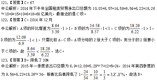 中公解析:2015年2月,快递业务收入为136亿元,业务总量为8.2亿件,每件的平均收入为136÷8.2<136÷8=17元,故答案选A。