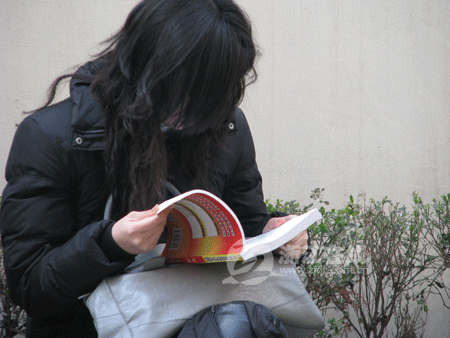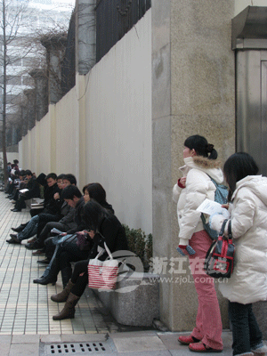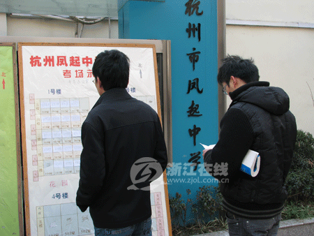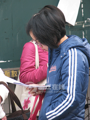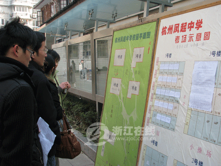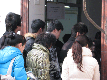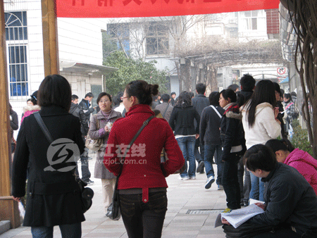 8点15分,考试大楼前已围满参考的考生,在等待进场铃声响起的同时,考生们也在埋头争分夺秒地看资料。人群中,记者见到了刚毕业一年的小徐(化名),他正专心致志地在站在一角看时事资料。小徐说,上午考的是申论,所以把准备的时事新闻再看一遍,例如大学生就业问题、三鹿奶粉事件等等。“虽说现在已经有份工作,但还是觉得做公务员比较稳定些。”小徐笑着告诉记者。