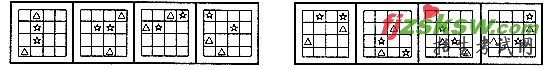 这道题不同于以往的位置题,元素的移动没有规律,但是它们移动路线是有规律可循的。从前四个图中,我们可以发现,两个五角星是在大正方形的对角线上移动,两个三角形是在大正方形的四条边上移动,如下图: