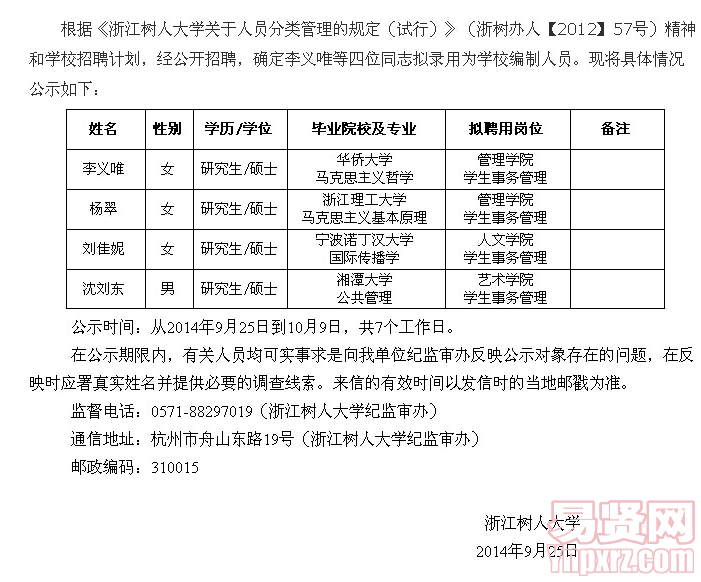 [图文]2014年浙江树人大学拟录用学校编制名单公示