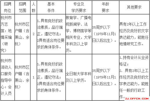 (1)杭州市方志馆招聘岗位:杭州市密渡桥路70号美都恒升名楼3017室。联系电话及联系人:0571-85253684 85253694 金先生。