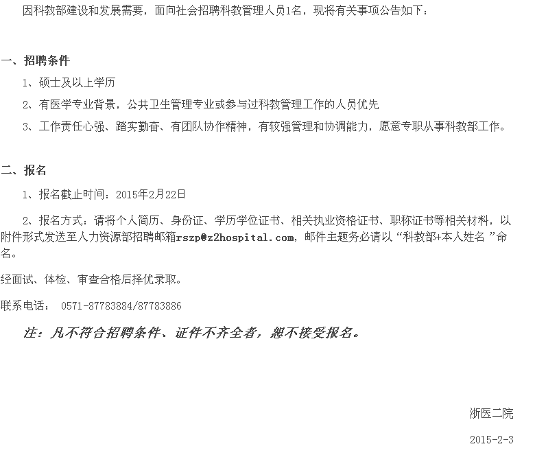[图文]浙江大学医学院附属第二医院2015年招聘科教管理人员的启事