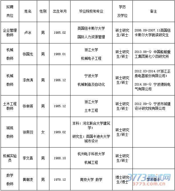 中科院宁波材料所公开招聘拟聘用人员公示按照《宁波市事业单位公开招聘工作人员实施办法》和2015年中科院宁波材料所公开招聘高层次人才公告(2015年2月3日)规定的程序,中国科学院宁波材料技术与工程研究所公开招聘工作通过公开报名,已进入择优聘用程序。根据面试、考核、体检结果,在合格人员中,经中国科学院宁波材料技术与工程研究所领导班子集体研究择优确定下列5位拟聘用人员,现公示名单如下: