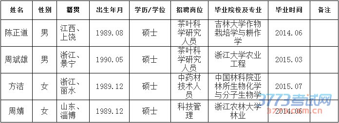 根据《2015年丽水市农业科学研究院公开招聘专业技术工作人员招聘公告》的有关规定,经公开报名、资格审查、考试、体检、考察,决定拟聘用陈正道、周斌雄、方洁、周婧4位同志为丽水市农业科学研究院工作人员,现予以公示,征求广大干部、群众的意见,有关事项通知如下: