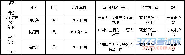 按照《宁波市事业单位公开招聘工作人员实施办法》和宁波市科技局下属事业单位公开招聘工作人员公告(2015年11月2日发布)规定的程序,市科技局宁波市科技信息研究院公开招聘工作通过公开报名、统一考试,已进入择优聘用程序。根据专业技能测试、面试、考核、体检结果,在合格人员中,经市科技局宁波市科技信息研究院领导班子集体研究择优确定下列3位拟聘用人员,现公示名单如下: