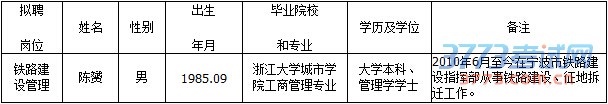 按照《宁波市事业单位公开招聘工作人员实施办法》和《宁波市铁路建设指挥部公开招聘工作人员公告》(2015年7月13日)规定的程序,宁波市铁路建设指挥部公开招聘工作通过公开报名、笔试、面试、体检、考核,已进入择优聘用程序。根据笔试、面试、考核、体检结果,在合格人员中,经宁波市铁路建设指挥部领导班子集体研究并报宁波市交通委党委讨论通过,择优确定下列1位拟聘用人员,现公示如下: