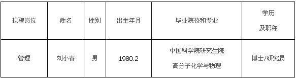 按照《宁波市事业单位公开招聘工作人员实施办法》和中科院宁波材料所公开招聘工作人员公告(2015年11月13日)规定的程序,中国科学院宁波材料技术与工程研究所公开招聘工作通过公开报名,已进入择优聘用程序。根据面试、考核、体检结果,在合格人员中,经中国科学院宁波材料技术与工程研究所领导班子集体研究择优确定下列1名拟聘用人员,现公示名单如下: