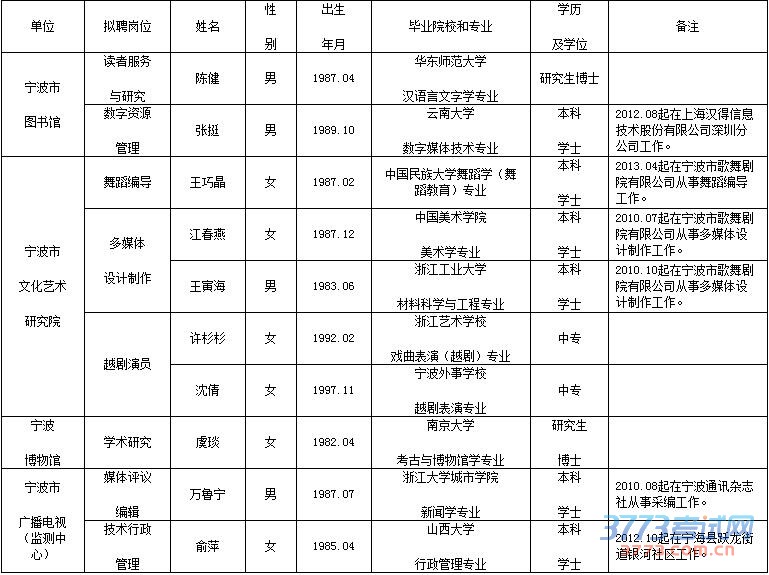 按照《宁波市事业单位公开招聘工作人员实施办法》和《宁波市文化广电新闻出版局属事业单位公开招聘工作人员公告》(2015年11月13日)规定的程序,市文化广电新闻出版局事业单位公开招聘工作通过公开报名、统一考试,已进入择优聘用程序。根据面试、体检、考察结果,在合格人员中,经市文化广电新闻出版局领导班子集体研究择优确定下列10位拟聘用人员,现公示名单如下: