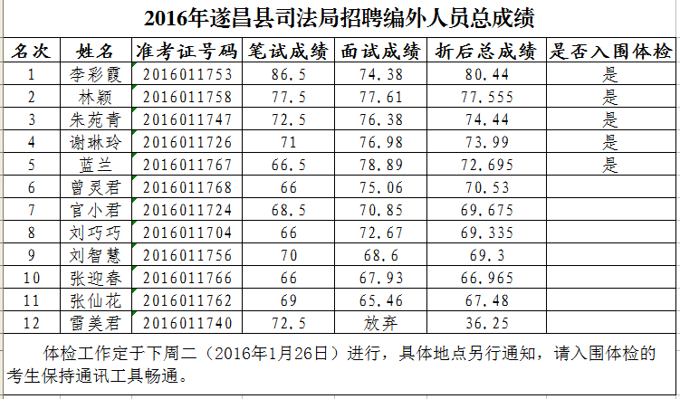 [图文]2016浙江丽水市遂昌县司法局编外人员招聘总成绩