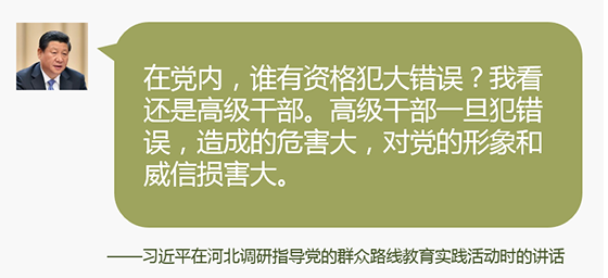 邓小平同志说过:“在中国来说,谁有资格犯大错误?就是中国共产党。”那么在党内,谁有资格犯大错误?我看还是高级干部。高级干部一旦犯错误,造成的危害大,对党的形象和威信损害大。我们绝大多数党的高级干部在思想上、政治上、作风上是过硬的。但是,也有少数高级干部身居高位久了,慢慢疏远了群众,出现了这样那样脱离群众的现象,个别的甚至违法乱纪、以权谋私、腐化堕落。高级干部必须时刻警醒自己,做到自重自省自警自励。