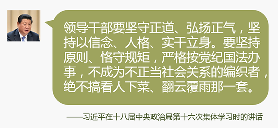 营造良好从政环境,要从人抓起,从人做起,也就是要从各级领导干部首先是高级干部做起。领导干部要坚守正道、弘扬正气,坚持以信念、人格、实干立身;要襟怀坦白、光明磊落,对上对下讲真话、实话、心里话,绝不搞弄虚作假、口是心非那一套;要坚持原则、恪守规矩,严格按党纪国法办事,不成为不正当社会关系的编织者,绝不搞看人下菜、翻云覆雨那一套;要严肃纲纪、疾恶如仇,对一切不正之风敢于亮剑,绝不搞逃避责任、明哲保身那一套;要艰苦奋斗、清正廉洁,正确行使权力,在各种诱惑面前经得起考验,“不以一毫私意自蔽,不以一毫私欲自累”。