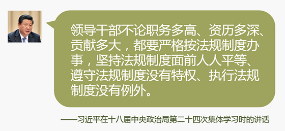 领导干部不论职务多高、资历多深、贡献多大,都要严格按法规制度办事,坚持法规制度面前人人平等、遵守法规制度没有特权、执行法规制度没有例外。越是领导干部,越是主要领导干部,越要自觉增强法规制度意识,以身作则,以上率下,尤其要善于依法规制度谋事、依法规制度管人、依法规制度用权,自觉维护法规制度的严肃性和权威性。