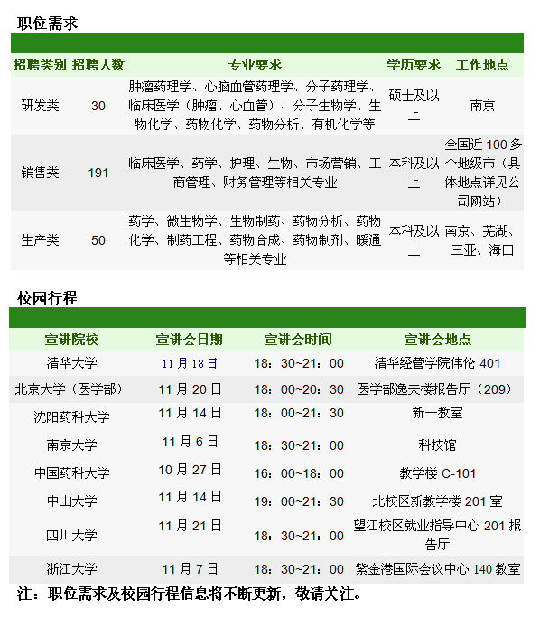 先声药业集团2010届校园招聘会将于10月正式启动,届时分别在全国各大中心及二级重点城市举行招聘会,在北京、杭州、成都、沈阳、南京、广州等城市的重点院校举行宣讲会,工作地点精确到地级市,务求精准招聘,敬请亲爱的同学们予以关注!