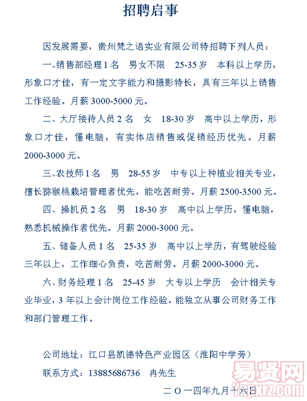 [图文]贵州梵之语实业有限公司2014年招聘启事