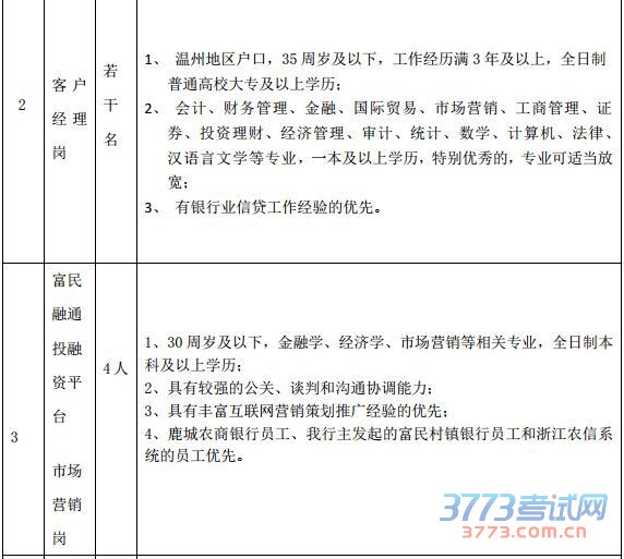 浙江温州鹿城农村商业银行股份有限公司是一家经中国银监会批准,在原鹿城农村合作银行的基础上改制而成的股份制商业银行。目前,全行拥有营业网点52家,在岗员工800多人,全行坚持“做小、做广、做精”的经营理念,加快经营转型,进一步传承发扬“普惠金融进万家”的农信文化,并于今年推出温州首家银行系互联网投融资平台---“富民融通投融资平台”,为客户打造出一个新颖、便捷、安全的网络理财投资平台,实现财富增值。因业务发展需要,现面向社会公开招聘优秀人才若干名。