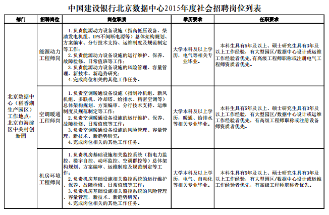 [图文]中国建设银行北京数据中心2015年社会招聘岗位表