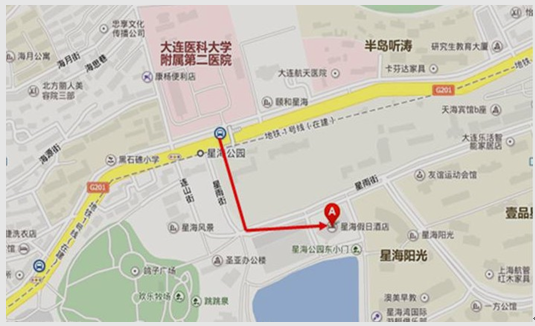 星海假日酒店位于大连市沙河口区星海广场C1区32号,大连医科大学附属第二医院正门对面,圣亚海洋世界东侧。乘坐16路、22路、23路、28路、37路、202路、406路、528路、531路、901路公交车在医大二院下车,南行即是。