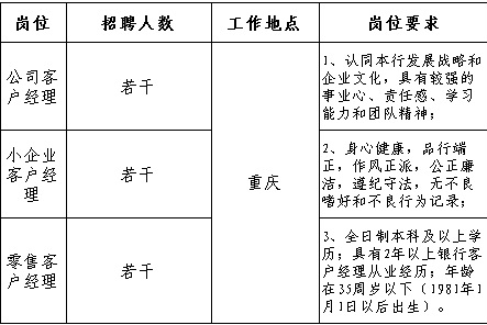 庆三峡银行股份有限公司是经中国银监会批准,于2008年2月成立,由市委、市政府直接管理的地方性股份制城市商业银行,总部位于重庆市江北嘴CBD,营业网点覆盖重庆所有区县。近年来,在服务“科学发展、富民兴渝”和重庆市五大功能区域建设过程中,本行秉承“一切为你着想”的经营理念,坚持中小企业银行、零售银行、理财银行、库区银行的市场定位,深化改革、创新发展,管理水平不断提升,盈利能力持续增强,目前已建设成为一家资本充足、内控严密、效益良好、质量优良、监管指标优化的区域性银行,位列英国《银行家》杂志“2015年全球银行一千强”第645位。因发展需要,现公开客户经理数名,我们诚邀有志有识之士,共创辉煌的明天!