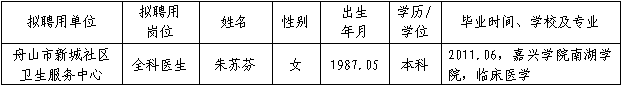 根据《浙江省事业单位公开招聘人员暂行办法》和《2014年上半年舟山市卫生和计划生育局部分直属单位公开招聘工作人员公告(2014年第5号)》规定,按照公开、公平、公正的要求,经过考试、体检、考察等程序,拟聘用朱苏芬同志为事业单位在编人员(具体名单如下),现予公示,公示时间:2014年8月11日—8月19日(7个工作日)。