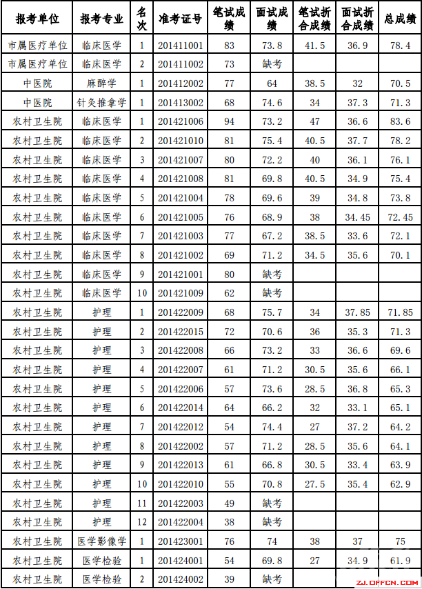 根据江山市卫生局、江山市人力资源和社会保障局《2014年江山市第二次公开招 聘卫生系统事业单位工作人员公告》精神,现将参加笔试、面试人员的总成绩从高分 到低分公布如下。