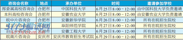 今年省考试院将从6月25日起,分片分段主办2014年在皖招生院校系列现场咨询活动。活动分为皖中片、皖北片、皖南片、沿江片四片,分别由安徽新华学院、阜阳师范学院、安庆市教育招生考试院、安徽工程大学承办。此外,省考试院还将与中科大联合举办部委属高校招生现场咨询会,与安徽农业大学联合举办本科高校招生现场咨询会(详见下表)。(记者刘标)