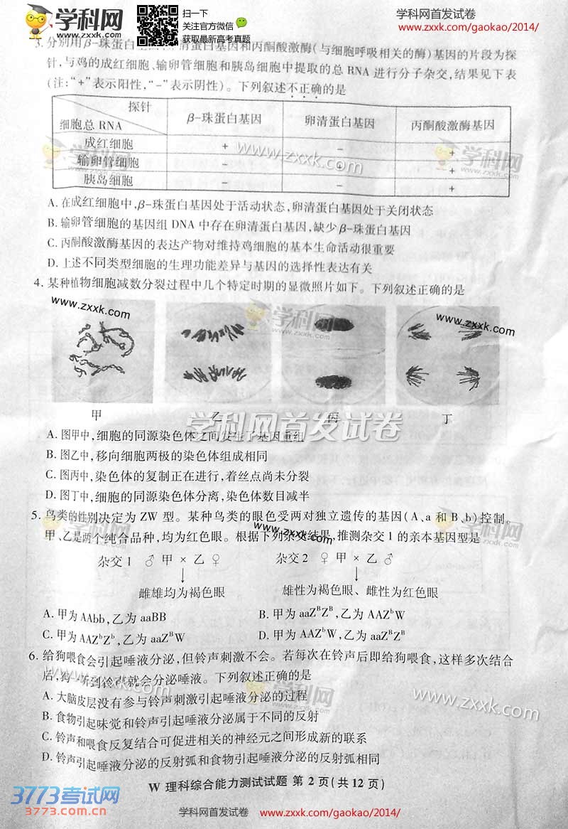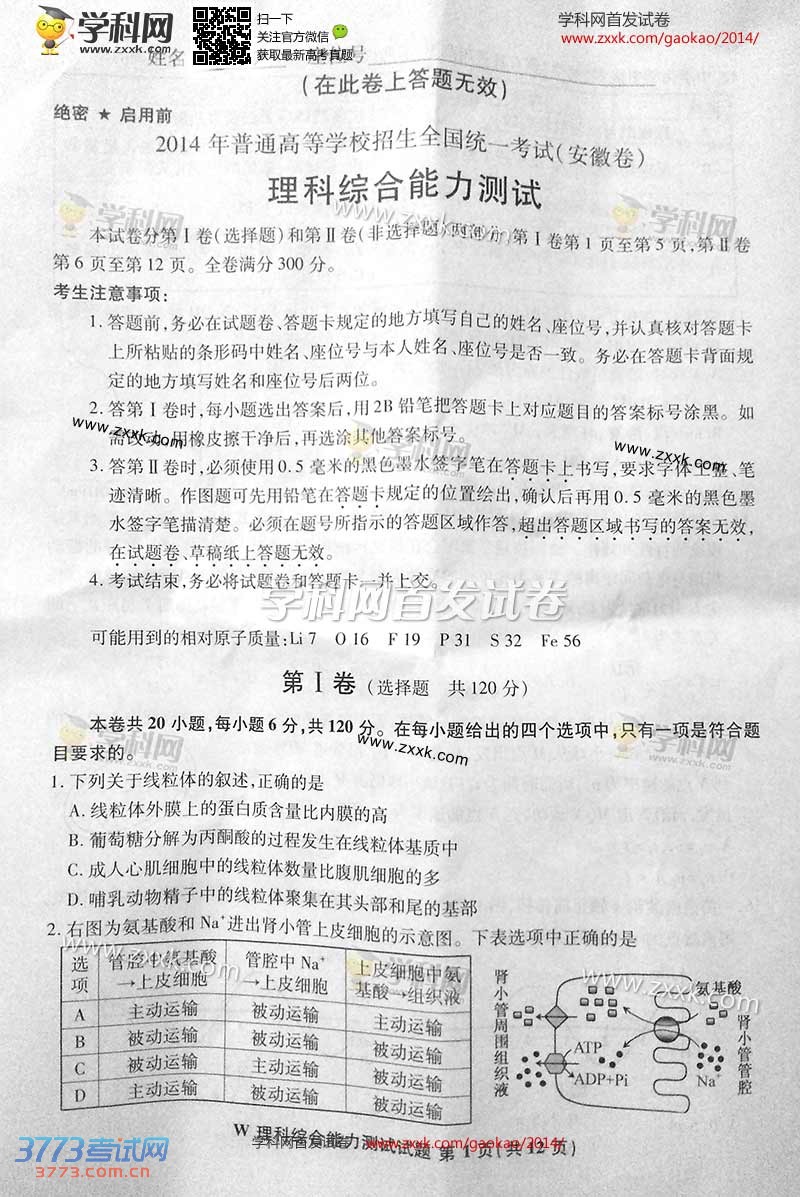 安徽理综卷图片版_2014年普通高等学校统一考试试题及答案