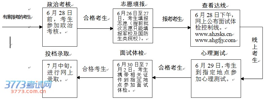 第三步.公布划线。6月28日下午,在“安徽招生考试网”(www.ahzsks.cn)和“中安国防网”(www.ahgfjy.com),公布参检分数线、心理测试和面试体检地点,考生自行上网查看。