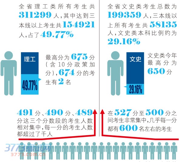 文科二本线为500分,线上考生共37290人,在527分至500分之间考生非常集中,几乎每一分都有600名左右的考生;三本线以上的所有考生共有58135人。