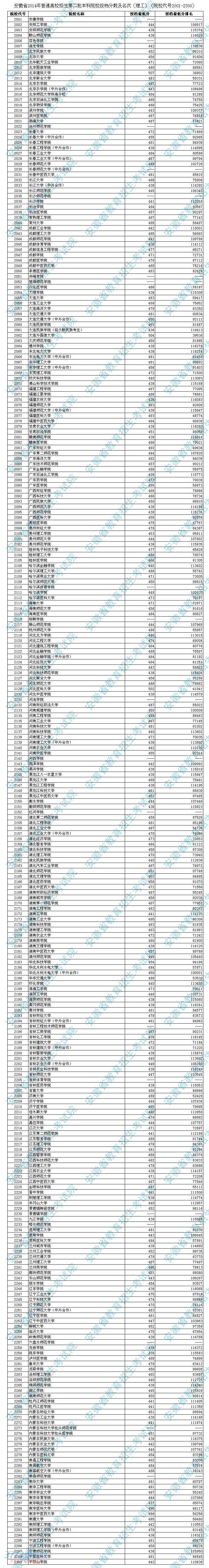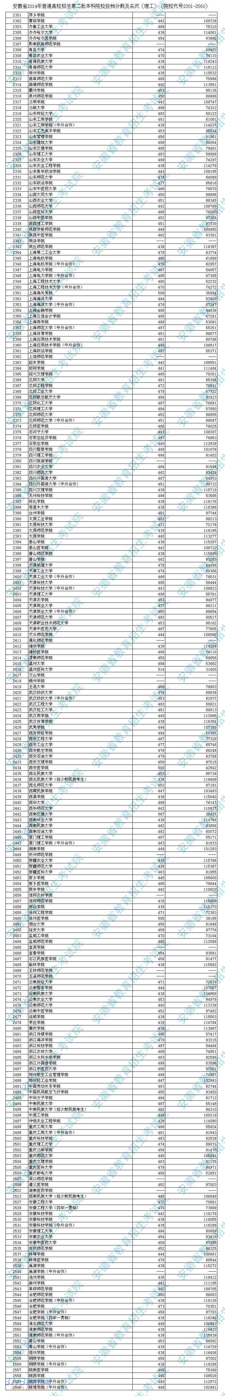 安徽省2014年普通高校招生第二批本科院校投档分数及名次(理工)(院校代号2301-2560)