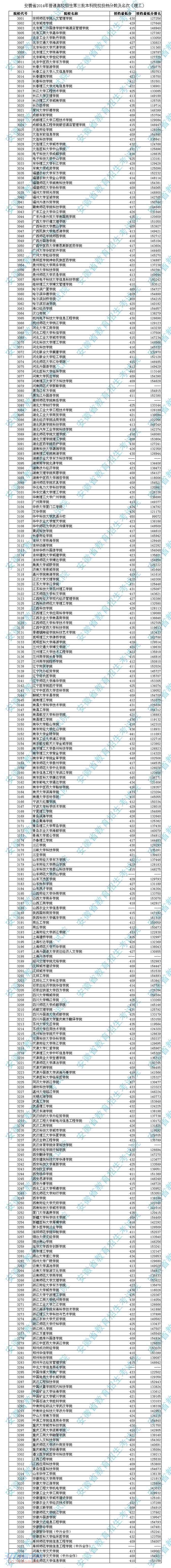 2014安徽高考三本院校投档分数及名次(理科)