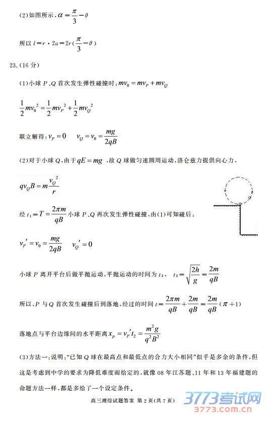 得:r= sinθ=高三理综试题答案 第2页(共7页)