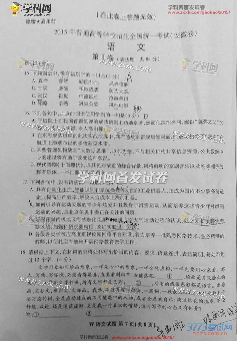 [组图]2015安徽高考语文试题及答案(部分答案)