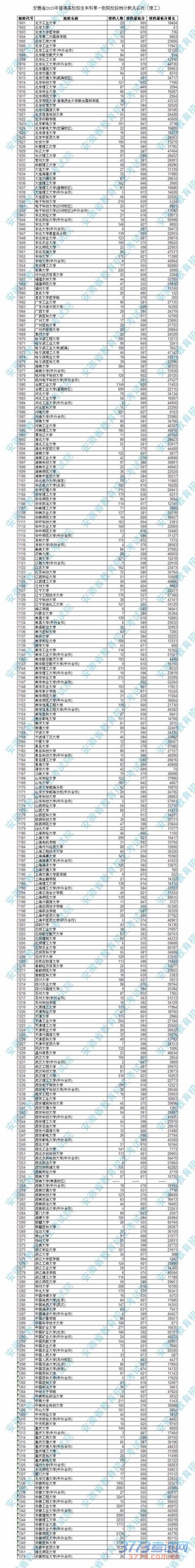 安徽省2015年普通高校招生本科第一批院校投档分数及名次(理工)