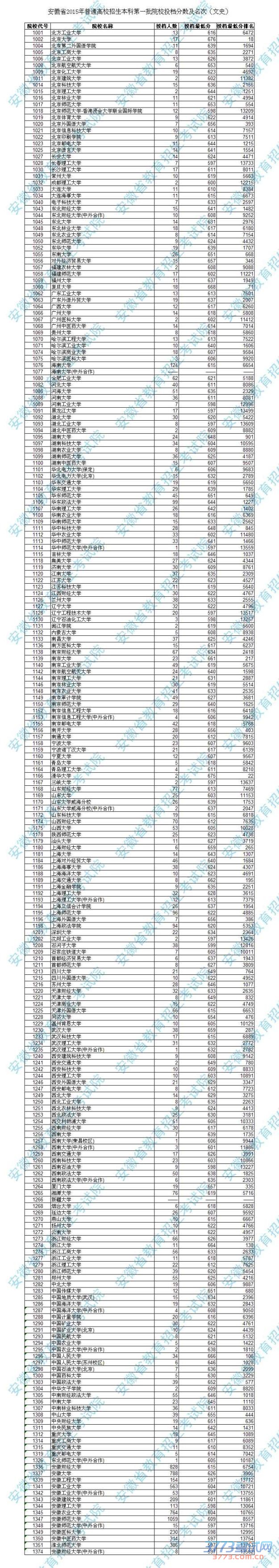 安徽省2015年普通高校招生本科第一批院校投档分数及名次(文史)