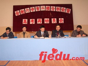 四月的校园,阳光明媚,惠风和畅,春意盎然。4月3日下午,合肥六中2008年“市二模分析总结会”暨“市三模考前动员会”在学校体育馆如期举行,本届700多名高三学生及其家长参加了会议。会上牛和荣副校长首先向百忙之中前来参加家长会的高三家长表示感谢,接着,牛校长通报了市教育局划定的二模分数线,具体是:理科一本507,二本426,三本386;文科一本530,二本472 ,三本438。同时,牛校长还通报了我校二模考试的成绩,在充分肯定文理科成绩全面优秀的基础上,尤其表扬了高三(1)班田钟毓同学以621分的优异成绩荣获合肥市文科第一名。然后,牛校长还通报了我校划定的各类分数线。通过对比表明本届高三学生成绩稳定,好于往届,前景乐观。最后牛校长勉励学生发扬连续作战的精神,苦战60天,争取2008年高考全面胜利。