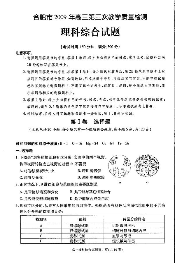 [组图]2009年合肥市三模理综试卷及答案