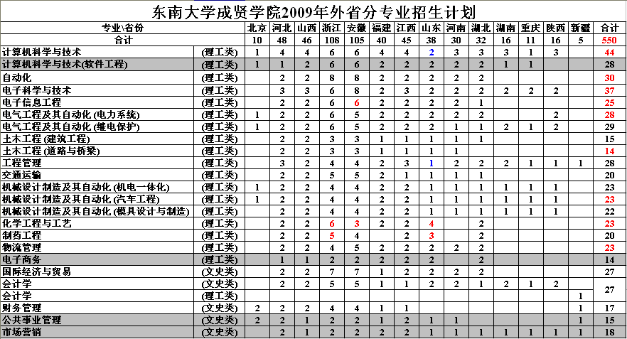 东南大学成贤学院2009年外省分专业招生计划