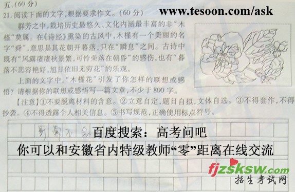 作文材料总结了“木槿花”朝开暮落却有丰富内涵的特征,并给出了古人或感伤或乐观的诗句,要求学生由此展开联想或生发感悟写作。