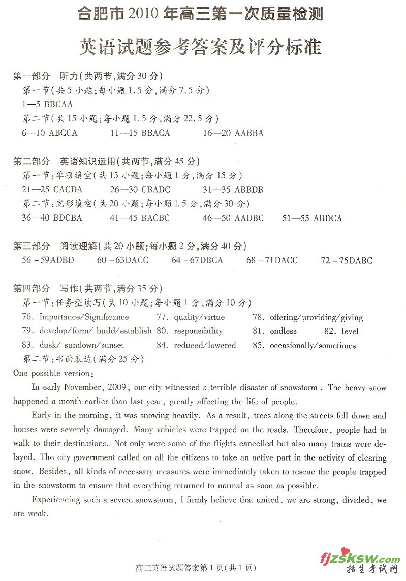 [组图]2010年合肥一模英语试卷答案及评分标准