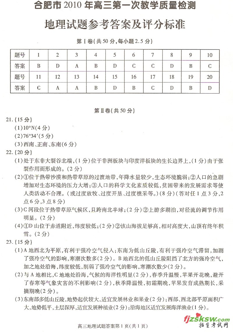 [图文]2010年合肥一模地理试卷答案及评分标准