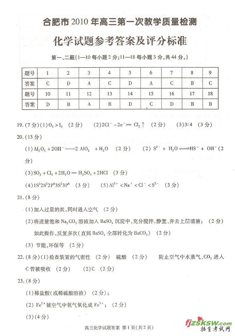 [组图]2010年合肥一模化学试卷答案及评分标准