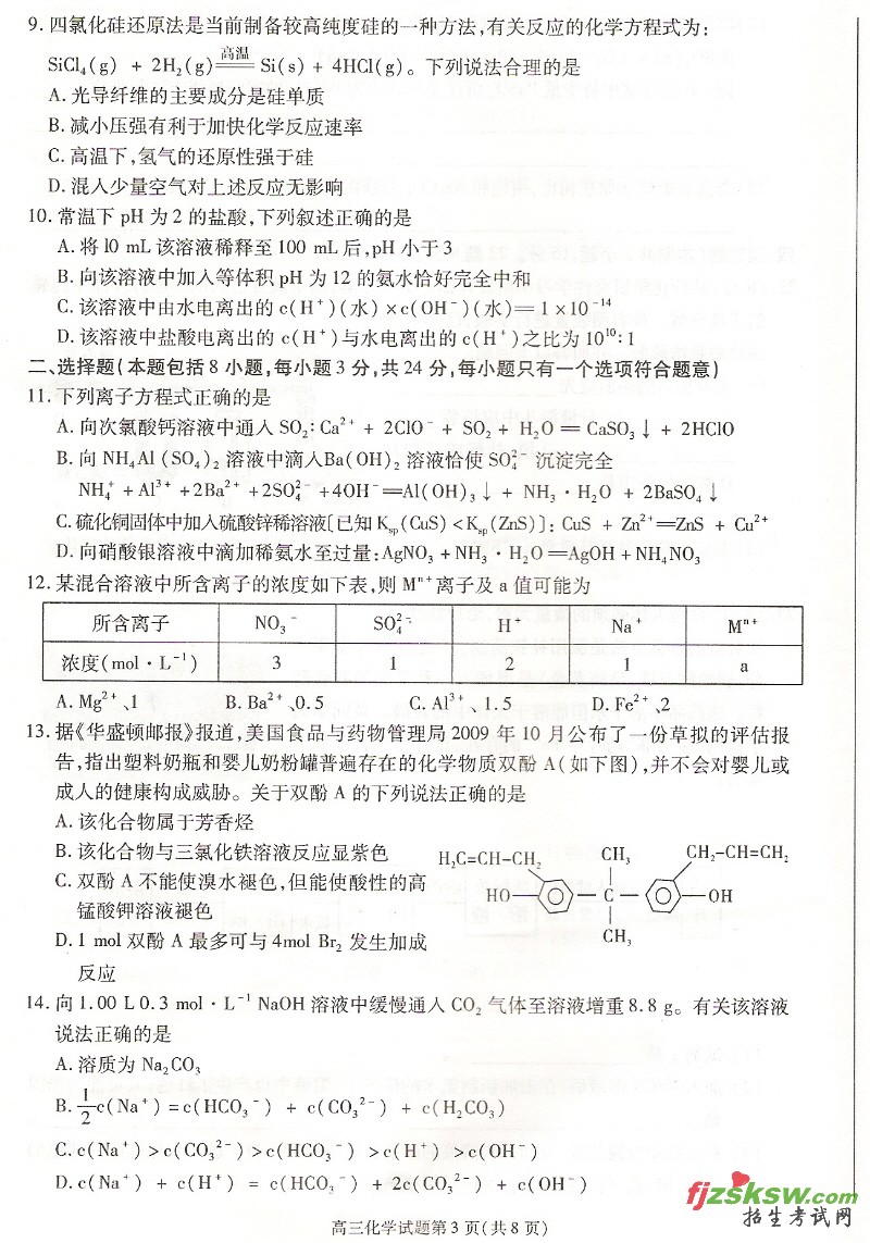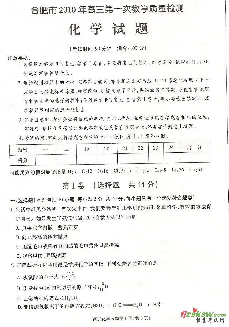 安徽高考][组图]2010年合肥一模化学试卷答案及评分标准