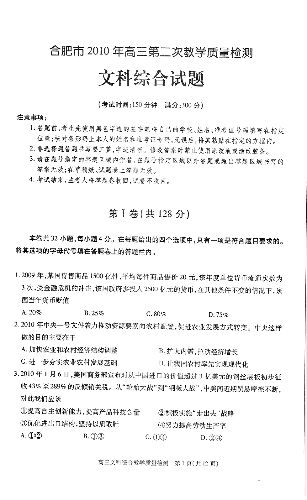 安徽高考][组图]2010年合肥市二模文综试题答案