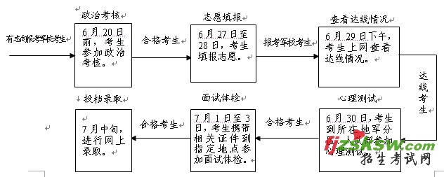 1.政治考核。志愿报考军校的考生,于6月20日前,参加由县(市、区)人民武装部、当地招生办公室、所在中学和户口所在地派出所共同组织的政治考核,认真详实填写《军队院校招收普通中学高中毕业生、普通高等院校招收国防生政治考核表》(以下简称《政治考核表》,该表可向所在中学或人武部领取)。合格考生的《政治考核表》由考生在参加面试、体检时上交省军校招生办公室。各位考生必须妥善保存,不得污损或遗失。政治考核不合格或未参加考核的,不能报考军队和国防生院校。