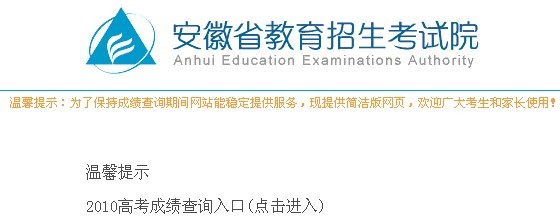 中国教育新闻网讯 6月25日上午安徽省招委会结束后,将公布2010年安徽省普通高校招生最低控制分数线。预计在午后,可以通过安徽教育网(www.ahedu.gov.cn)、安徽招生考试网(www.ahzsks.cn)、及安徽教育资源网(www.ahedu.cn)查询高考成绩。考生和家长也可拨打声讯电话:16887722(高考文科查分)、16887723(高考理科查分)查询成绩。