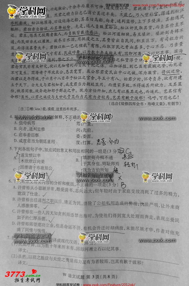 [组图]2012年安徽普通高等学校招生统一考试语文卷试题答案