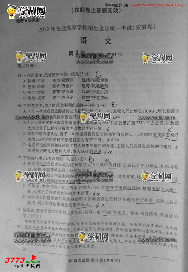 [组图]2012年安徽普通高等学校招生统一考试语文卷试题答案